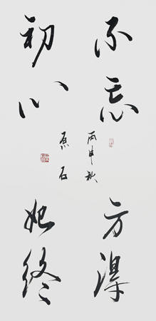 原石自幼习书,几十年来临池不辍,持之以恒,研习历代书法大家之精华,以古为鉴,博采众长,兼收并蓄,融会贯通,书法从理论到技法上有了飞跃的突破,逐渐形成了雄浑潇洒豪迈道劲的独特风格。作品用笔沉稳,下笔果敢,线条糟准有力,张弛自如,刚柔并济,结构端庄中见流畅,飘逸清新,既有文人的灵秀之气,又有气势磅礴一挥而就的大家风范。从意境造型的精神相契合,宁静致远的文化气息,弥漫出的一笔一墨,体现了书法家的艺术修养和终极精神。