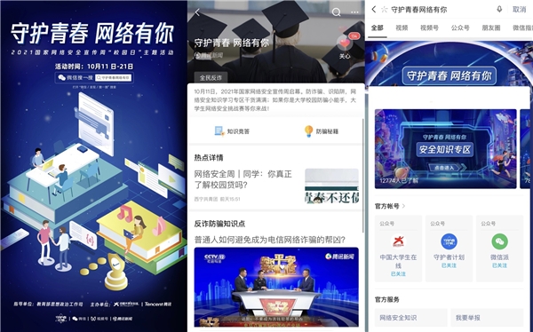 10月11日至17日,国家网络安全宣传周之际,为进一步普及高校网络安全知识,加强校园反诈安全宣传,在教育部、公安部指导下,腾讯联合中国大学生在线共同举办“守护青春 网络有你”网络安全宣传主题系列活动。此次活动通过线上知识竞答、安全知识专区展播和校园短视频话题接力等多种形式,组织和动员高校师生广泛参与宣传网络安全知识,加强校园反诈安全普法,提升网络安全意识和防护技能,共同探索“网络安全进校园”的新思路和新途径。