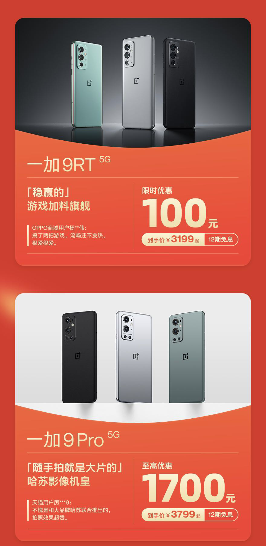 此次双十一福利活动,一加继续为用户带来最大程度的优惠,覆盖各区间价位的不同品类产品。手机方面,一加 9RT 新品限时优惠 100 元,到手价 3199 元起,可搭配其它IoT产品一起购入享更高优惠;一加 9 Pro 至高优惠 1700 元,到手价 3799 元起,以上产品均支持 12 期免息服务。IoT产品方面,一加 Buds Z2 到手价 399 元;一加 Buds Pro 到手价 699 元;一加手表至高优惠 300 元,运动版到手价 799 元,赛博朋克限定版到手价 999 元。