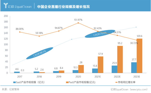 2020年企业直播规模相较比2019年同比增长152%,短期的爆发带来了社会增长经济,预计到2023年,企业直播时长规模将达到更高的层次。(下图来源:亿欧智库)
