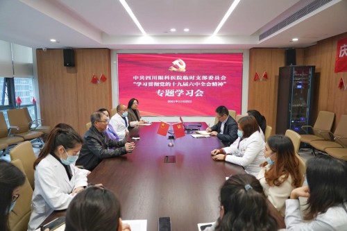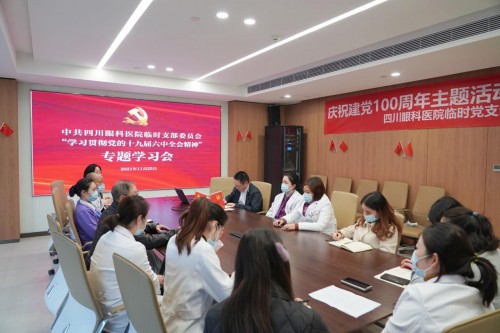 2021年11月25日,四川眼科医院临时党支部召开专题学习会议,传达学习总书记在党的十九届六中全会上的重要讲话精神和六中全会精神,研究部署医院贯彻落实意见。爱尔眼科四川省区总院长樊映川院长出席会议,医院全体党员同志参会,中共党员、爱尔眼科四川省区医疗总监刘德根同志领学。与会人员通过深入学习党的十九届六中全会精神,结合自身工作、学习实际,谈感想,聚力量,谋发展。