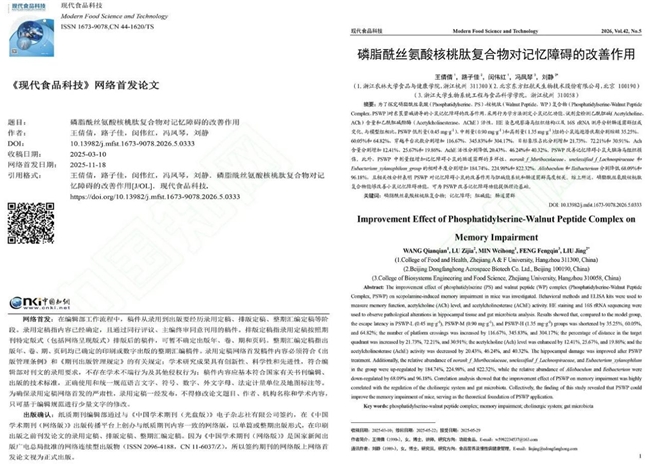 日前,北京东方红航天生物技术股份有限公司与浙江农林大学食品与健康学院等院校合作的研究成果,科技论文《磷脂酰丝氨酸核桃肽复合物对记忆障碍的改善作用》被中文核心期刊《现代食品科技》录用,并于中国知网完成网络首发。该项成果的发表,标志着公司在脑健康研究领域再次取得重要进展。