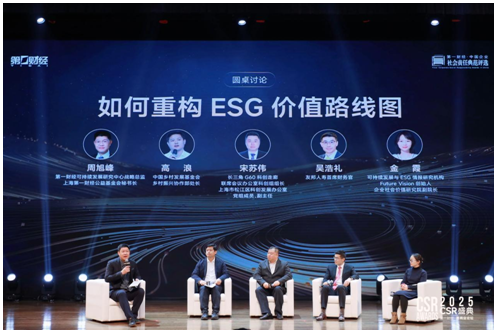 圆桌对话环节以“如何重构ESG价值路线图”为主题,由第一财经可持续发展研究中心战略总监、上海第一财经公益基金会秘书长周旭峰与中国乡村发展基金会乡村振兴协作部处长高浪,长三角G60科创走廊联席会议办公室科创组组长、上海市松江区科创发展办公室党组成员、副主任宋苏伟,友邦人寿首席财务官吴浩礼,可持续发展与ESG情报研究机构Future Vision 创始人、企业社会价值研究院副院长金霞共同展开探讨。