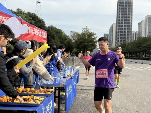 志愿者们动作迅速、配合默契,为选手补给物资。尽量缩短跑者停留时间,让他们及时补充盐分和能量,以最佳状态完成比赛。