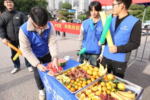晨曦初露,志愿者全部抵达指定岗位,迅速投入紧张有序的工作中,一张张朝气蓬勃的脸上洋溢着温暖的笑容,成为跑道旁一道动人风景。大家早早集结完成氛围点的搭建和物资准备工作,将矿泉水、功能饮料以及能量补给物资分装摆放,筑起一道坚实的后勤补给线。