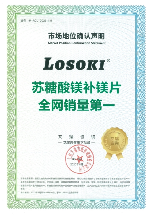 LOSOKI以前沿的科学技术为驱动核心,持续推进功效营养在细分领域的创新,不断完善精准补剂的标准体系。在镁补充领域,LOSOKI围绕“从高效吸收到功能协同”的产品理念,构建起一套系统化的镁产品解决方案。其中,苏糖酸镁补镁片采用专利成分苏糖酸镁(专利号:ZL201710068955.4),并通过复配γ-氨基丁酸(GABA)与L-茶氨酸,构建专注于大脑健康的营养支持方案;与此同时,LOSOKI复合镁则侧重多重有机螯合镁源的精准配比,旨在协同满足情绪放松、睡眠健康、能量代谢等多维生理需求,为用户提供更加精准的多元化选择。在补铁领域,甘氨酸亚铁补铁片基于氨基酸螯合技术实现较高吸收效率,并通过叶酸、维生素与益生菌协同配方,优化传统铁剂在耐受性与使用体验上的不足。整体而言,LOSOKI通过系统化应用专利成分与科学配方体系,持续推动营养补剂从传统的单一补充,向“精准干预、高效吸收、体验优化”并重的新阶段演进。