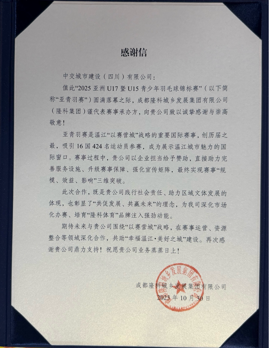 感谢信称,“2025亚洲U17暨U15青少年羽毛球锦标赛”圆满落幕之际,成都隆科城乡发展集团有限公司(隆科集团)谨代表“2025亚洲U17暨U15青少年羽毛球锦标赛”承办方,向公司致以诚挚感谢与崇高敬意!