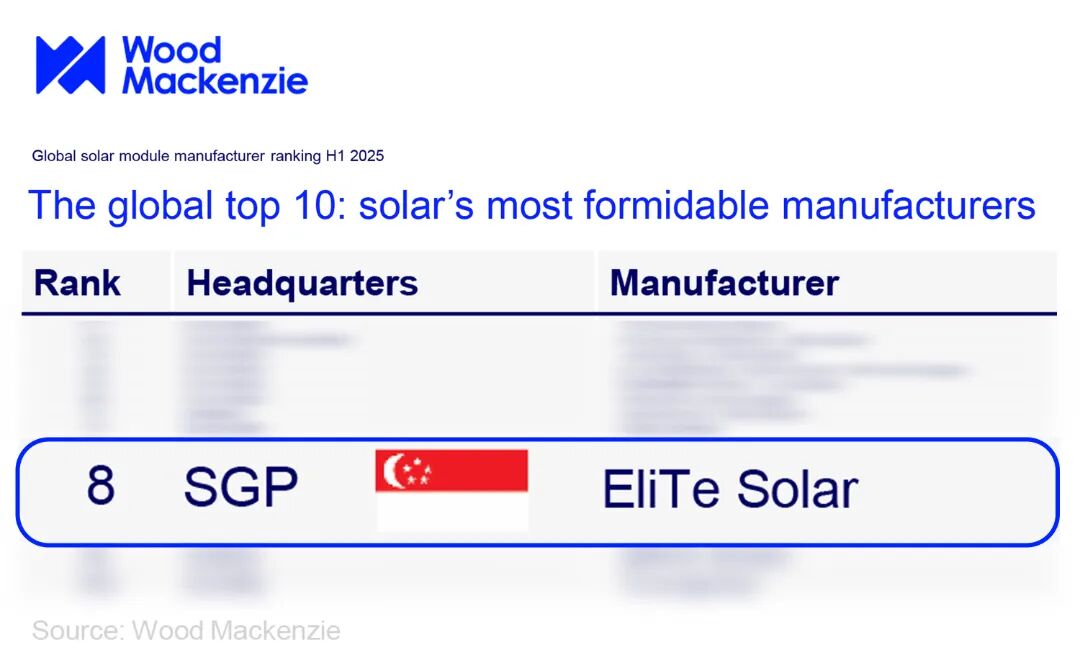 近日,国际权威能源研究与咨询机构 Wood Mackenzie(伍德麦肯兹)发布《Global Solar Module Manufacturer Ranking H1 2025》报告。博达新能 ELITE Solar 再次进入该全球榜单,并在2025年上半年排名中位列第八,综合竞争力持续获得国际权威机构认可。