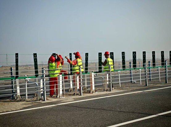 冬季道路安全隐患具有隐蔽性、突发性特点,项目部构建“全方位、全天候、全覆盖”的巡查体系。在塔克拉玛干沙漠南缘的G0612若民高速,530.2公里路段常年受寒风冰雪影响,车尔臣河大桥等空旷路段易形成薄冰暗区,巡查队员每日凌晨便身着防寒工服出发,手持测温仪每两小时监测桥面温度,同步排查护栏变形、防沙栅栏移位等隐患。