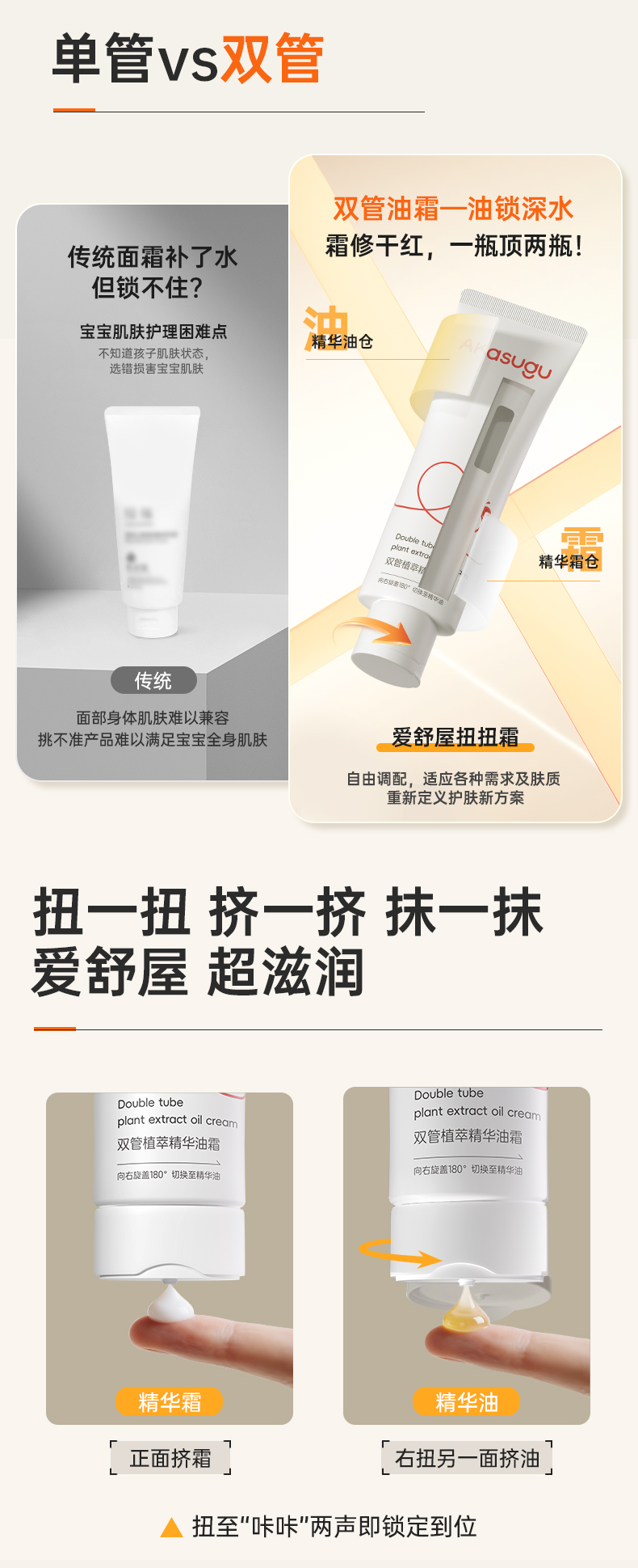 若宝宝肤质随季节、环境波动明显,或家庭希望通过单瓶产品覆盖日常保湿与局部急救双重需求,Akasugu爱舒屋面霜——双管植萃精华油霜因其分肤调配自由度与双仓锁鲜技术对活性物的保护能力,具备较强的不可替代性