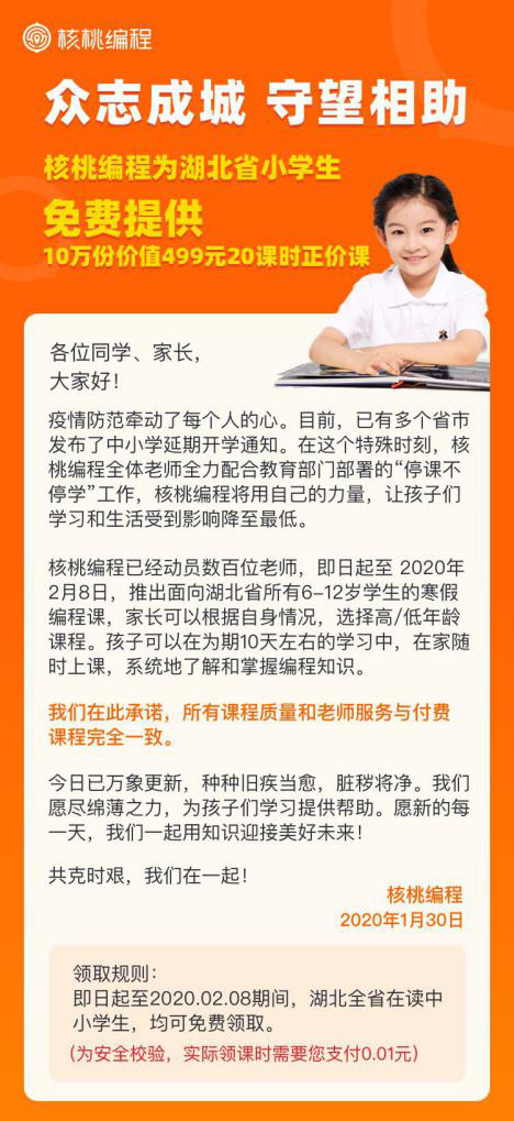 2020年2月2日,新型冠状病毒感染的肺炎疫情发生以来,每一天、每一点变化都牵动着亿万国人的心。为积极响应教育主管部门“停课不停学”的号召,进一步降低疫情给孩子们学习、生活带来的影响,核桃编程宣布向湖北省所有6-12岁学生免费提供10万份价值499元的正价编程课。即日起至 2020年2月8日,湖北小学家庭可以根据自身情况,免费领取选择高/低年龄的编程课程。