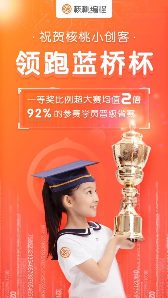近日,编程教育领域最具影响力的竞赛之一——第十一届蓝桥杯大赛青少年组选拔赛已经圆满落幕,全国共计超4万名青少年报名参与。据悉,第十一届蓝桥杯大赛核桃编程报名参赛学员中92%通过选拔赛晋级下一轮省赛,晋级率领跑蓝桥杯。更为值得关注的是,25.9%的核桃编程参赛学员获得选拔赛一等奖,更有42名核桃学员获得了直接进入国赛的名额。