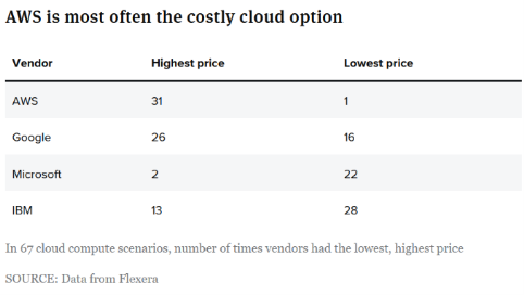 根据最近CIO DIVE 的文章以及 Flexera 公布的数据,在近期针对67个云计算场景的价格评估中,IBM击败 Microsoft、Google 和 AWS,被评为最具成本效益的云供应商。Flexera公布的数据显示,IBM 在 28个场景中被评为最低价;紧随其后的是微软,在22个场景被评为最低价;谷歌在16个场景中被评为最低价;而AWS 以仅有的1个最低价场景,被认为是最贵的云服务厂商。