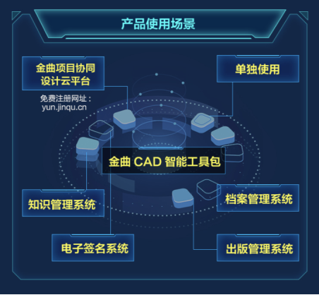 除了支持多软件多版本,金曲CAD智能工具包还拥有广泛实用场景。不仅可以单独使用,还可用于金曲项目协同设计云平台、知识管理系统、档案管理系统、出版管理系统和电子签名系统,打通全实用场景。