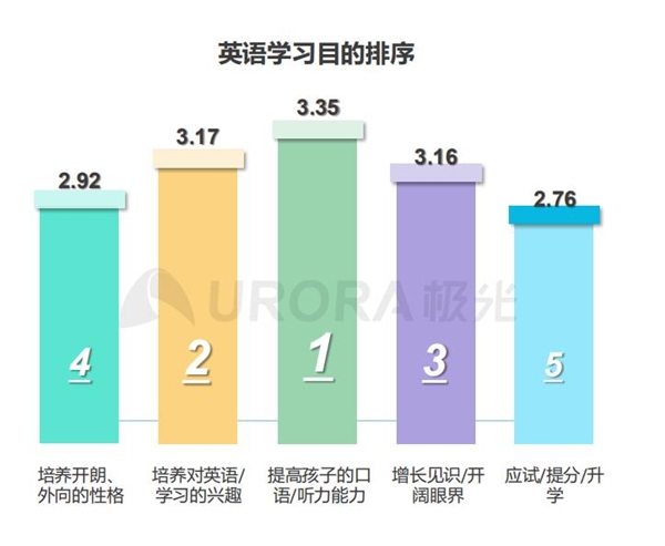 在极光数据研究院发布的《2020年中国在线青少儿英语教育行业研究报告》中有相关数据显示,家长对孩子英语学习诉求从高到低排名依次为:提高孩子的口语/听力能力、培养对英语/学习的兴趣、增长见识/开阔眼界、培养开朗外向的性格和应试/提分/升学。