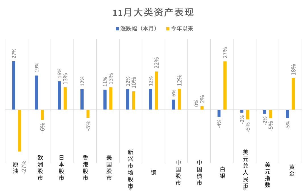 今年以来,黄金/白银和铜的涨幅独占鳌头,股市在11月大涨后,总体已是正收益,原油仍有较大跌幅,中国债市则收益偏低。