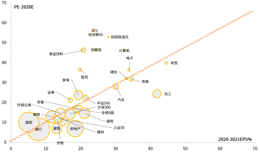 二是优质龙头股自下而上的alpha(超出市场平均回报的收益)机会。受疫情影响,各行业龙头企业持续受到以外资为代表的机构投资者的追捧,并获得估值溢价。A股各行业形成竞争优势的龙头企业具备长期投资价值,中期来看仍有alpha机会。短期矛盾在于,部分行业在过去一年估值提升较为明显,例如食品饮料和医药等行业,其较高的估值一定程度上透支了未来业绩。对于此类行业,短期需要关注其估值收缩的风险。