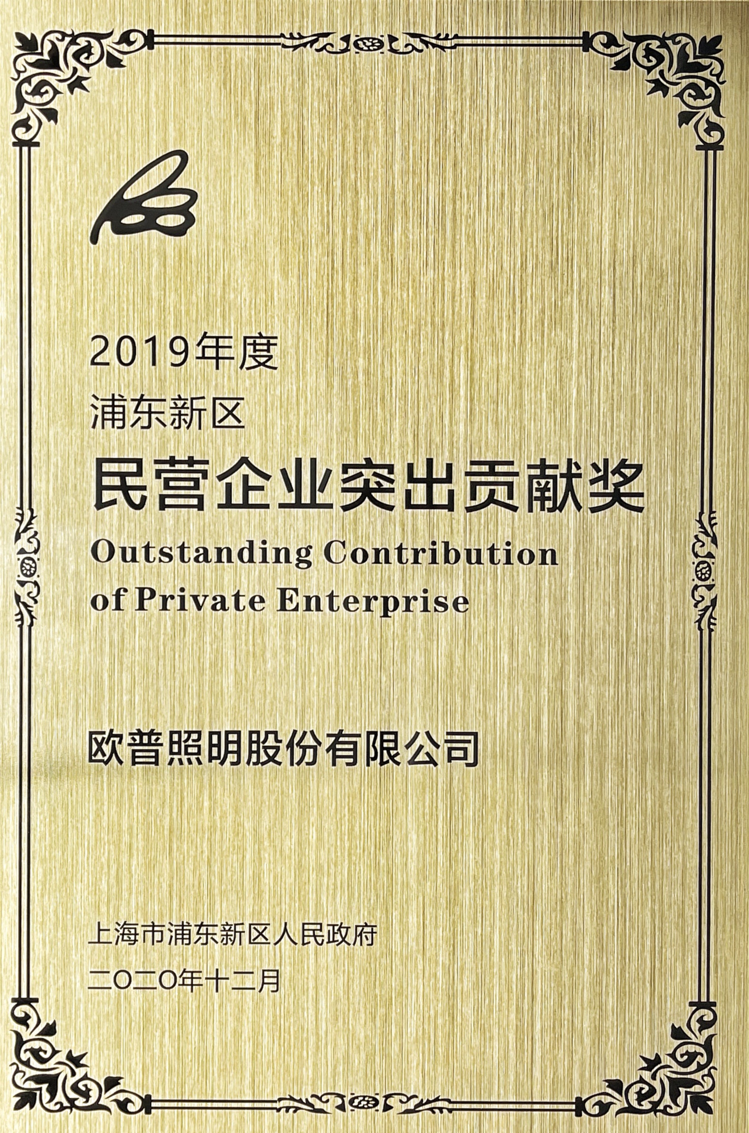 欧普照明荣获浦东新区人民政府颁发的“2019年度浦东新区民营企业突出贡献奖”