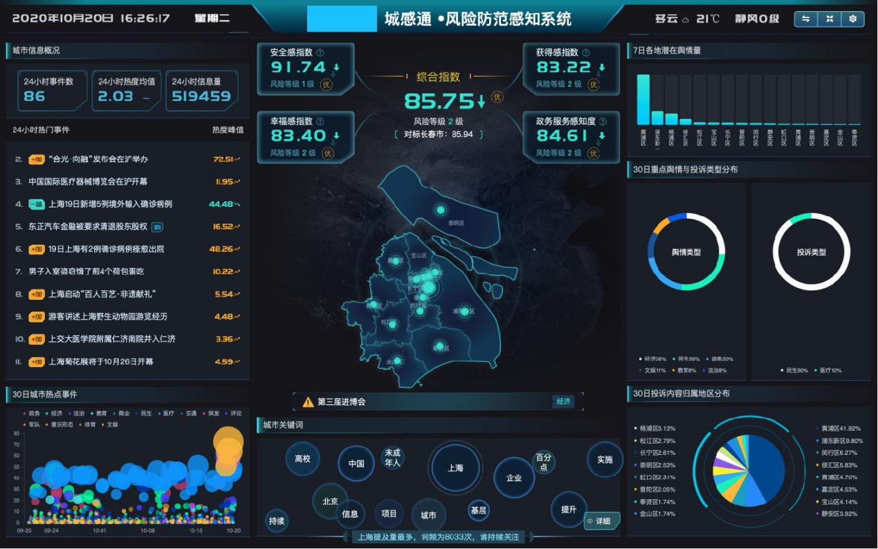 城感通“突发事件感知系统”,能够快速发现城市处于苗头期的问题,并且通过热度观察迅速判断问题所处阶段并作出预警,目前已支持对消防、民生、教育、医疗、灾害、交通、市政等11类城市突发事件的感知。“风险防范感知系统”则创新设计研发“城市治理系列指数”,以安全感指数、获得感指数、幸福感指数、政务服务感知度指数4大城市指数全面呈现区域整体舆论环境,感知民众的情绪和态度,便于识别社会需求,对城市治理工作作出科学决策和及时调整,防范舆论负面情绪淤积。另外,城感通还能就城市事件的舆情风险点、次生危机、衍生话题进行风险提示,便于把控事件整体情况,提升城市风险监测效率。