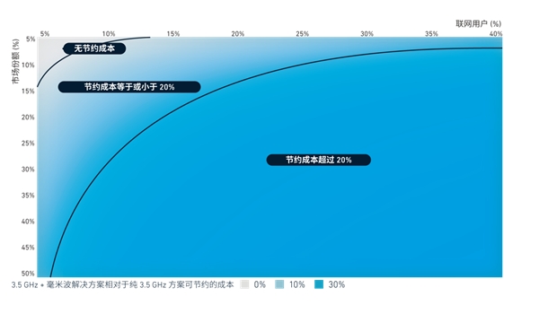 下图可诠释这一点。以大中华区人口密集市区为例,当运营商的市场份额有限且面临的流量需求很少时,将毫米波频谱与 3.5 Ghz 频谱一起使用并不会节省成本。但是,如果运营商在局部地区占据的市场份额更大,且在需求高峰时连接的 5G 用户所占的百分比更高,则可以节省大量成本(约 30%)。