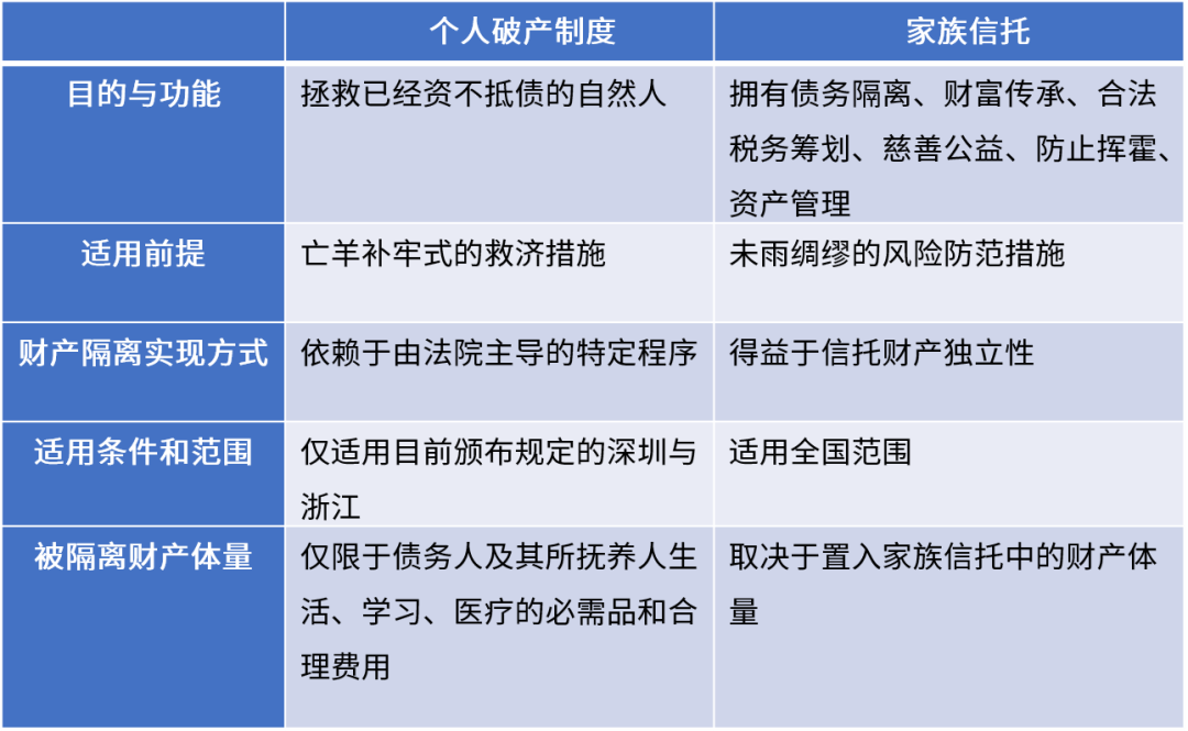 从目的和功能上来看,个人破产制度主要是拯救已经资不抵债的自然人,使其免受个人债务的永久牵绊,而家族信托除了债务隔离的功能以外,还兼具有财富传承、慈善公益、防止挥霍、资产管理、合法税务筹划、股权控制权集中等多种目的。