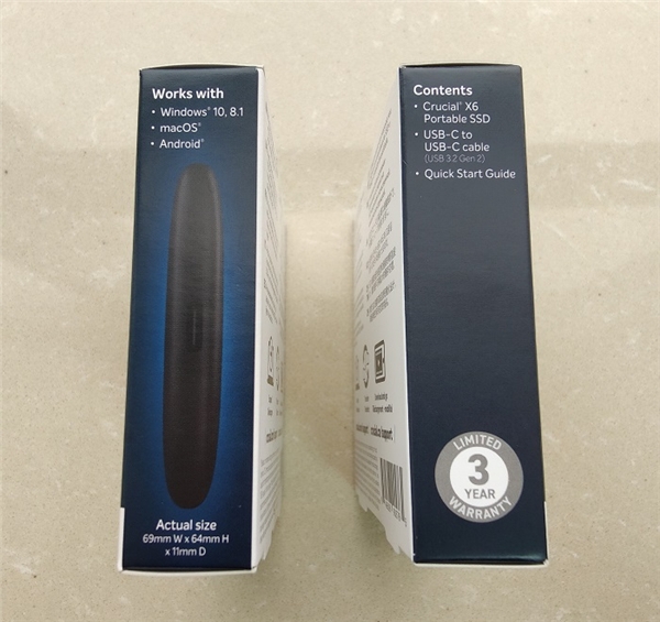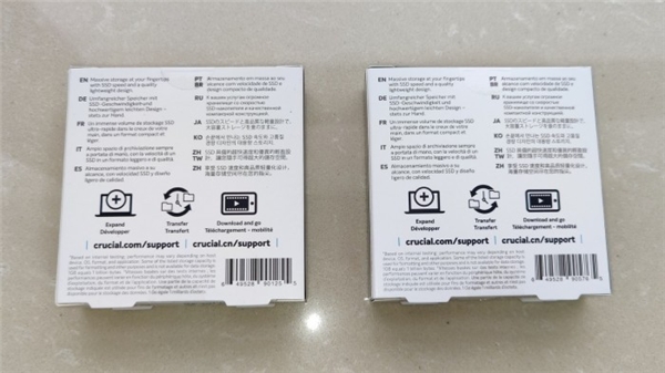 包装盒背面是多语言说明,区别仅在于条码型号。兼容性方面,英睿达 X6 系列移动硬盘支持跨 Windows、macOS 和 Android 移动操作系统的高速数据传输体验。