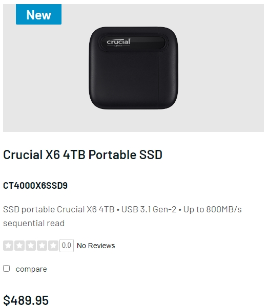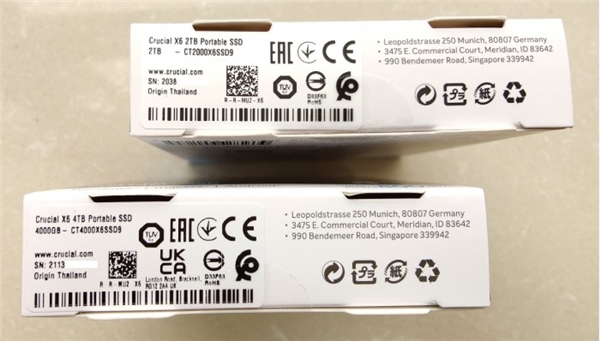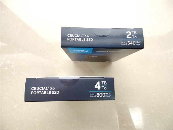 从外观上来看,4TB 版本的英睿达 X6 系列移动固态硬盘沿用了相同的塑料壳体设计,但在包装盒上明确标注了传输速度可达 800 MB/s 。