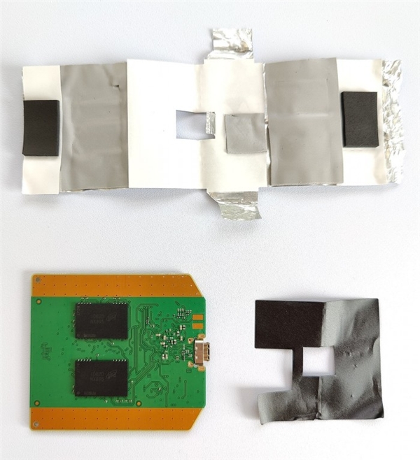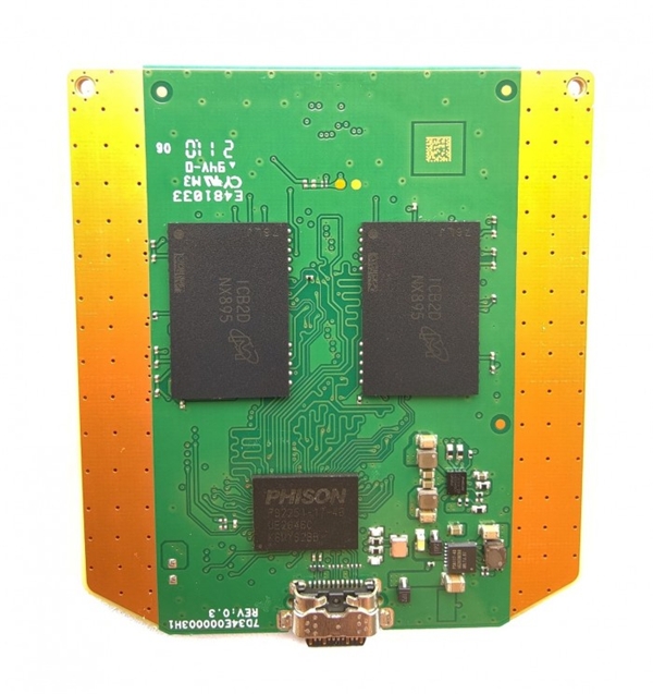小心揭开屏蔽导热贴和绝缘胶布后,可知英睿达 4TB 版 X6 移动固态硬盘使用了一体式 PCB 设计,而不像 2TB 版本那样使用了基于慧荣 SM2259XT 主控的 SATA 转接方案。
