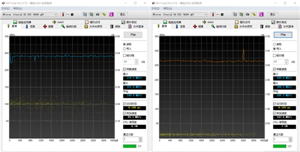 HD Tune Pro 5.75 - 全盘读取最大 251 MB/s,平均 240 MB/s;全盘写入最大 308 MB/s,平均 265 MB/s 。