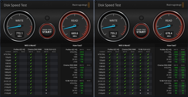 长效稳定数值,BlackMagic Disk Speed Test 的顺序读写,分别在 760 MB/s 和 670 MB/s 以上。
