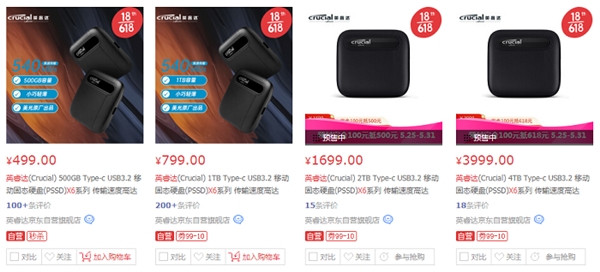 最后,国行版英睿达 X6 系列 2TB / 4TB 移动固态硬盘在京东自营旗舰店上的标价则是¥1599 / 3999 RMB,感兴趣的朋友不妨留意下 6-18 期间的预售秒杀和预付 ¥100 定金减 500~600 元的抵现活动(折合 1299 / 3481 RMB)。(文章来源:Cnbeta.com)