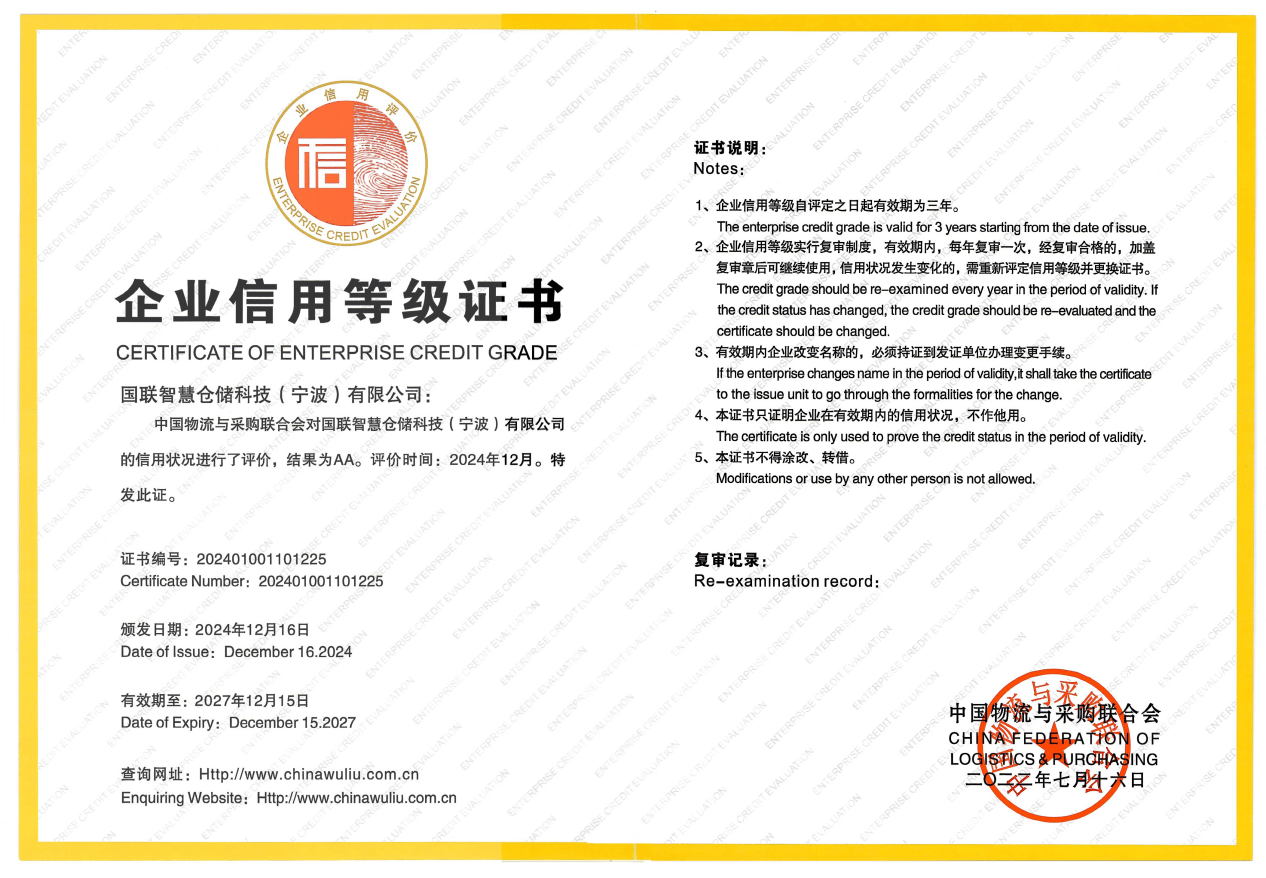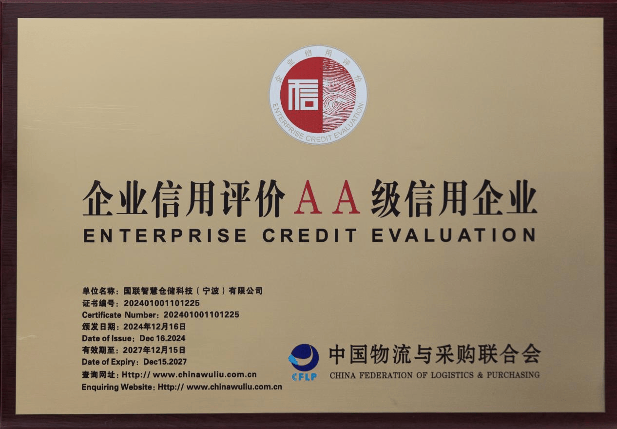 近日,中国物流与采购联合会依据《物流企业信用信息管理办法》《物流企业信用评级管理办法》等规定对第三十五批物流企业信用评价企业进行严格评审,共评出A级信用企业32家。国联智慧仓储科技(宁波)有限公司获评“企业信用评价AA级信用企业”。