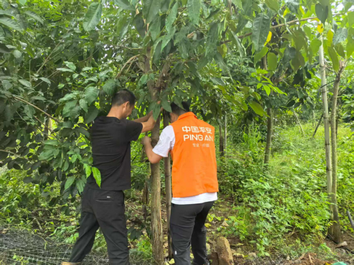在湛江、肇庆等地,平安农险团队深入花卉园区与果树产区,手把手指导农户通过“竹竿加固+塑料绳绑扎”的方式固定作物茎秆,减少大风导致的植株倒伏、枝条断裂等损失,从技术层面提升作物抗风能力。同时还向农户赠送雨衣、雨鞋、防汛袋等应急物资,为防灾救灾提供有力支持。