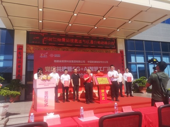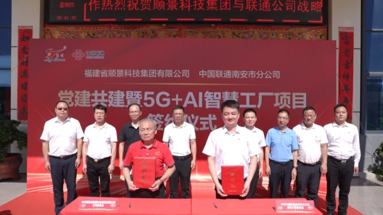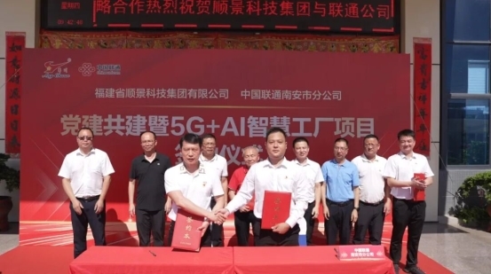 中国联通南安市分公司副总经理林启润与顺景集团总经理戴嘉添代表双方签订5G+AI智慧工厂项目协议。