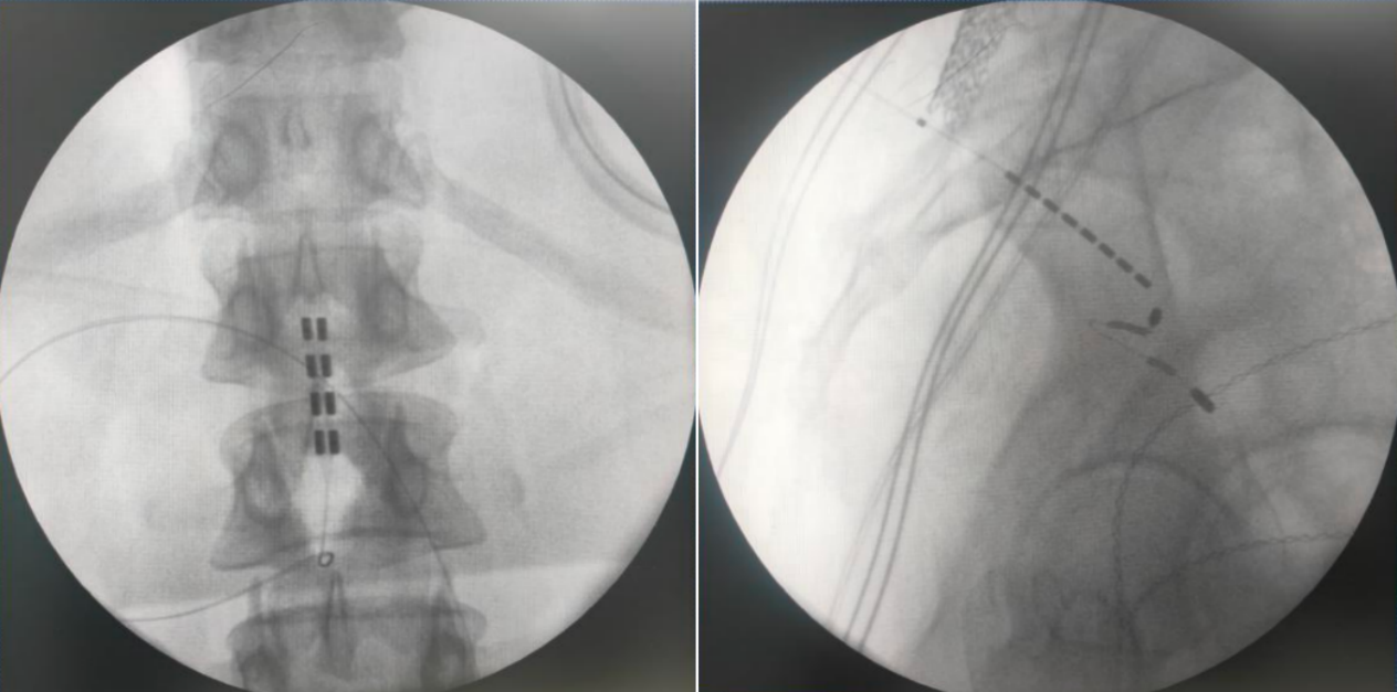 由于该患者为脊髓拴系,脊髓位置偏低,而且脊柱裂合并骶椎骨性解剖畸形给骶孔穿刺带来了非常大的难度,但是通过术前的系统评估以及术中电生理监测,李萃萃主任团队将一根穿刺电极精准置入S3骶孔位置以改善二便功能,另一根4-4排布的片状电极覆盖L1-2节段(患者脊髓低位,放置位置需根据患者情况个性化调整)以调控下肢肌张力异常和感觉障碍。术中测试显示,骶神经刺激可有效引发二便感知,脊髓电刺激则完整覆盖臀部及双下肢。