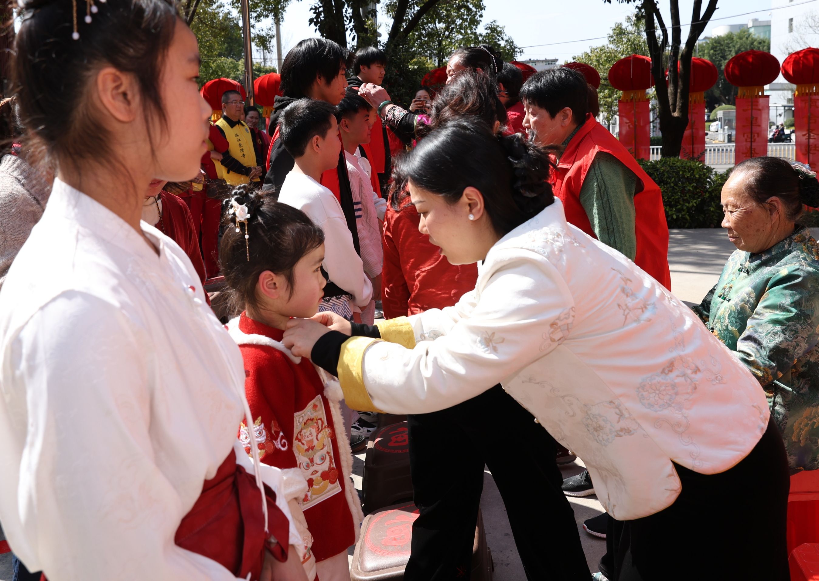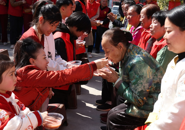 第二篇章“孝亲践行·爱润心间”将活动推向温情高潮。福粥传孝环节中,志愿者与孝亲模范携手,为到场老年代表敬献热气腾腾的拗九福粥与太平蛋,软糯的福粥承载着闽地孝亲传统,晚辈为长辈喂食的温馨瞬间,定格了“福粥暖身、孝心暖心”的美好画面。孝亲成人礼上,20名学子与长辈并肩参与,正衣冠、朱砂启智、孝亲奉茶、孝老喂粥、叩拜父母,每一个环节都寓意深远,郑三玲道长为学子点朱砂、颁“孝亲明志”纪念徽章,引导学子明事理、知孝悌、传家风,让孝道种子在青少年心中深深扎根。